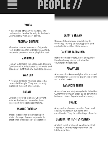 This is also a little unusual, I think, in that it's honestly more like a welcoming calm commune than somewhere that, by itself, is a place of intrigue or high adventure. Not that it can't be used in this contexts, but I kind of deliberately wanted a microsetting that could be used as a breather between more breathless moments and grander set pieces.